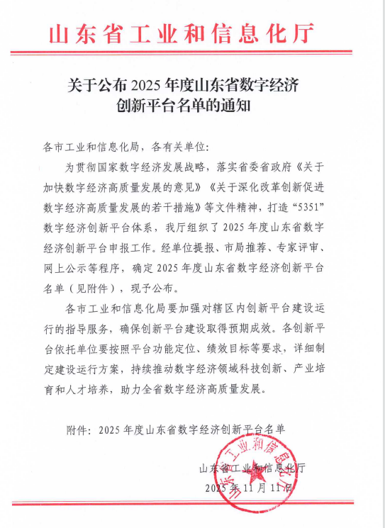 近日,山东省工业和信息化厅发布了《关于公布2025年度山东省数字经济创新平台名单的通知》,英国上市公司365凭借在数字经济领域人才培养的深厚积淀与创新实践,成功入选数字经济创新人才实训基地。